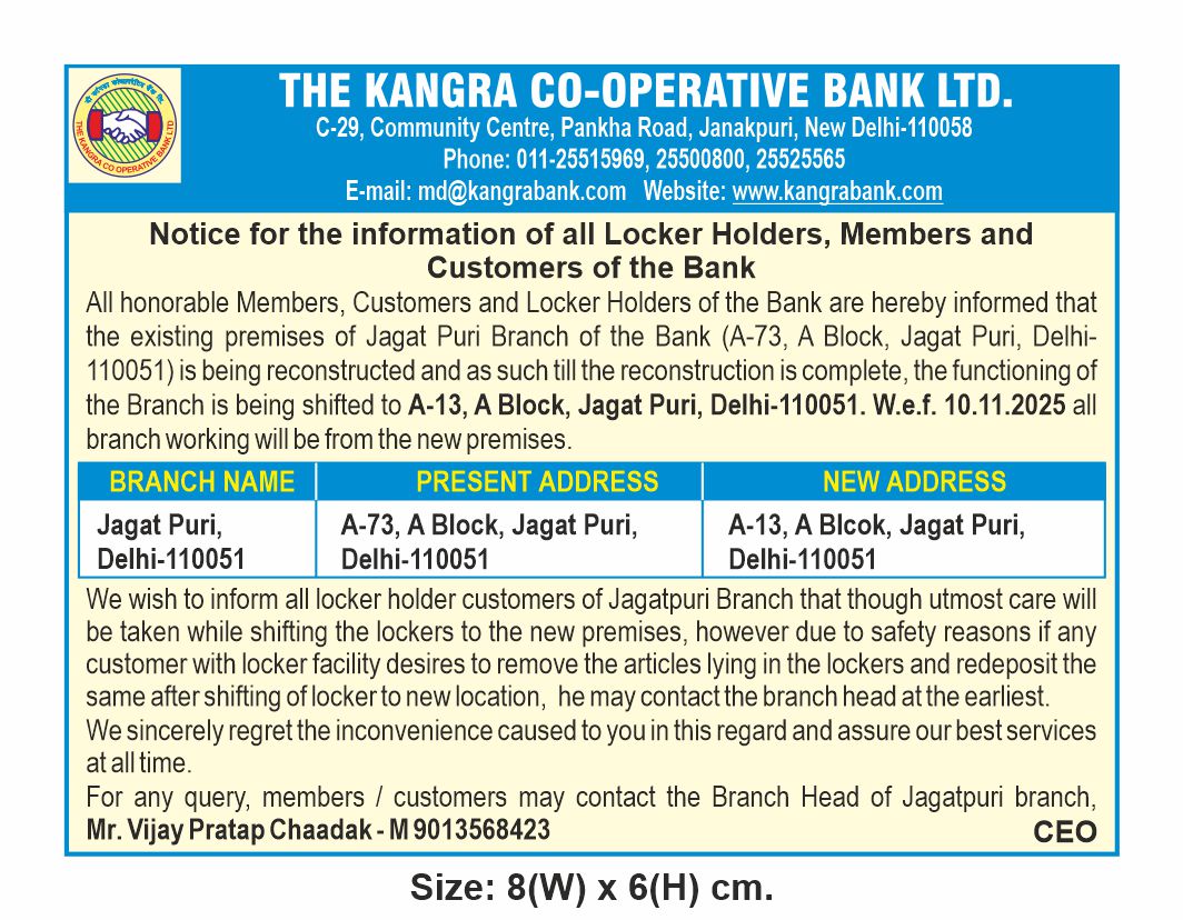 Notice for the information of all the Locker Holders, Members and Customers of the Bank: Shifting of Jagat Puri Branch |
